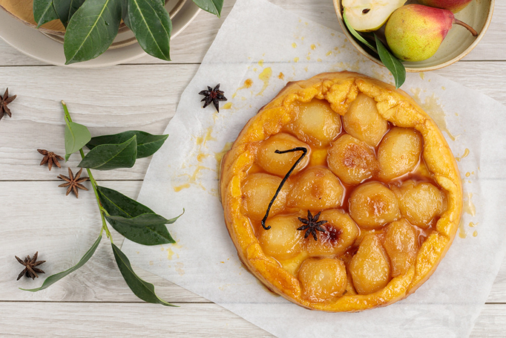 Shakar, suv va limon sharbatini birga qaynatamiz, so'ng esa ustidan sariyog' bilan vanilin solamiz. Karamel ustidan noklarni qo'yib chiqamiz keyin arpabodiyon urug'i va vanil ekstraktini solamiz.