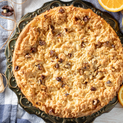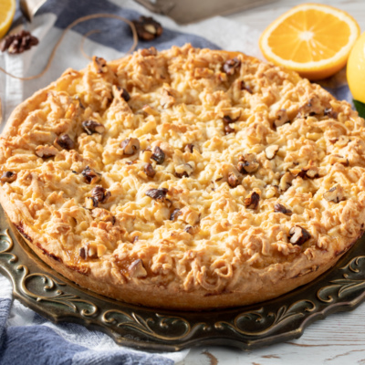 Muzlatgichdagi xamir bo'lagini olib, qirg'ichdan chiqarib olamiz va pirog ustidan sepamiz. Xohishga qarab, yana ustidan har xil yong'oqlardan sepish mumkin.