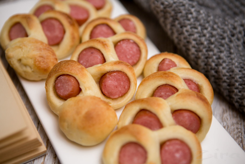 Xamirlarni chokli tomonini pastga qilib, patnisga teramiz. So'ng pichoq bilan har bir xamirni olti marta kesib chiqamiz. Bunda xamirning ustki qismi, sosiskalarni kesamiz, pastki xamirga esa tegmaymiz. Kesilgan bo'laklarni har tarafga qaratib chiqamiz.