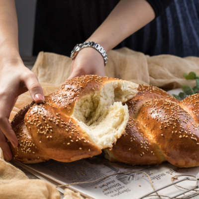 So'ng har bir xamir bo'lagini uzun lentasimon qilib yoyamiz va naycha "jgut"simon shakl beramiz. Uchala xamir uchini birlashtirib, xuddi soch o'rgandek o'rab chiqamiz.