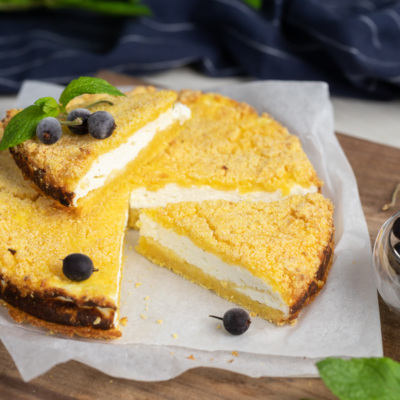 Qolipga sariyog' surtamiz, xamirli aralashmani 3/4 qismini sepamiz, ustidan asosni tekis qilib solamiz. Qolgan xamirni ustidan sepamiz.