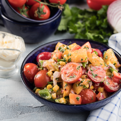 Kattaroq idishga pishgan kartoshka, makkajo'xori, bulg'or qalampiri, pomidor, qolgan kashnichni solamiz, ustidan aralashmani quyib, yaxshilab aralashtirib olamiz.
