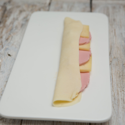 Kolbasani yarim oy shaklida, pishloqni esa yupqa to'rtburchak qilib to'g'raymiz.