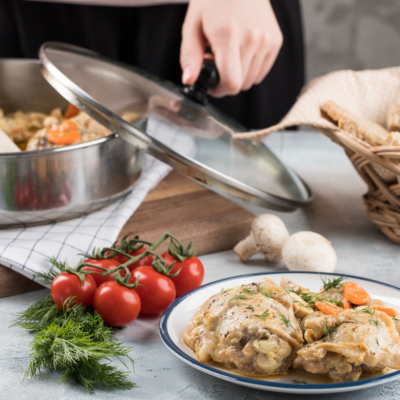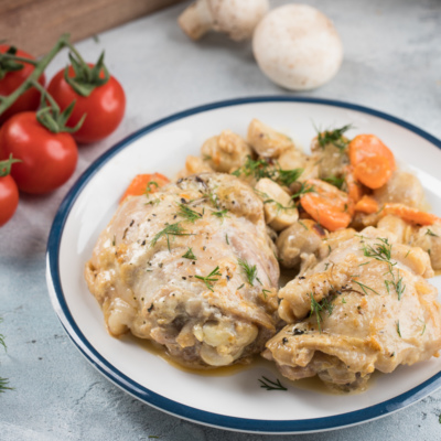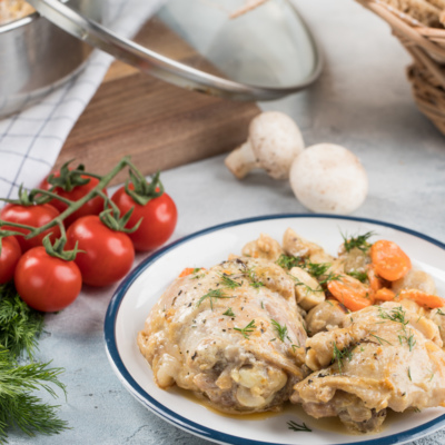 Qaymoq-qo’ziqorinli qaylada pishirilgan tovuq sonlari