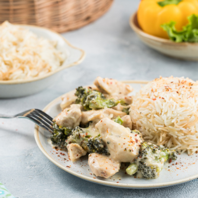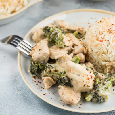 Qaymoqli qaylada pishirilgan tovuq va brokkolili taom