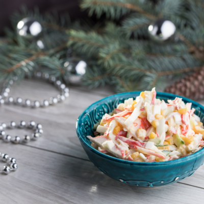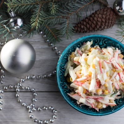 Qisqichbaqa tayoqchalaridan tayyorlangan salat ham xuddi «Olivye» kabi yangi yil dasturxonidan o’z o’rnini egallashga ulgurgan. Bunday salat tez va oson tayyorlanib, kerakli masalliqlar esa deyarli har bir ro’zg’ordan topiladi.