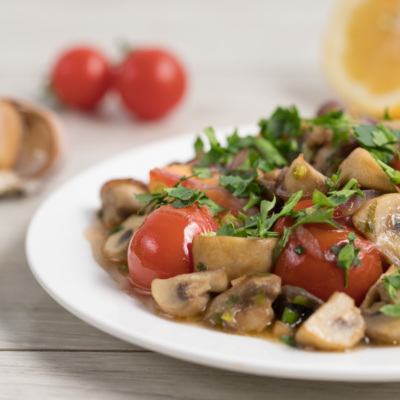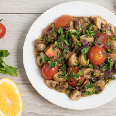 Ko'k piyozni mayda to'g'raymiz. Oddiy pomidorni sakkizga bo'lamiz, cherryni esa shundayligicha qoldiramiz.