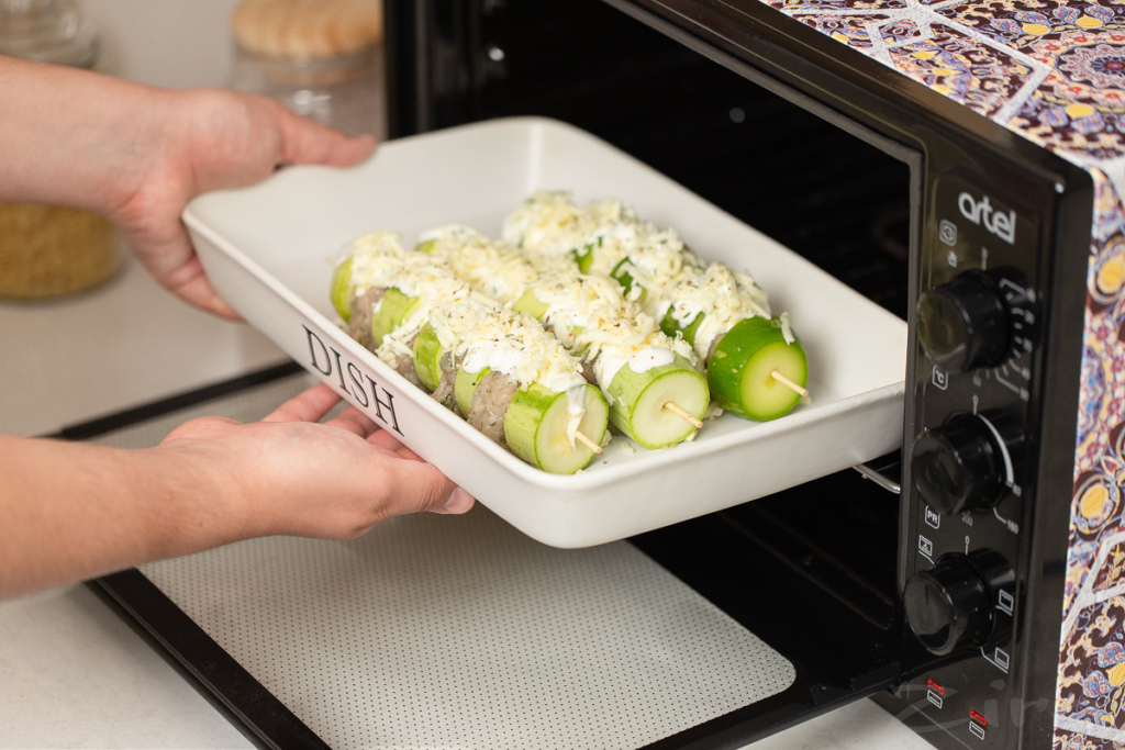 Kaboblarga smetana surtib, pishloq sepamiz. 180 C darajada qizdirilgan gaz pechiga 30-35 daqiqaga yuboramiz.