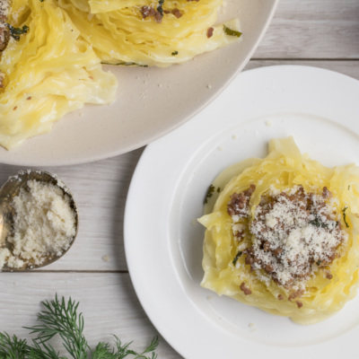Taomni tortishdan oldin to'g'ralgan ko'katlar va pishloq sepib bezatamiz.