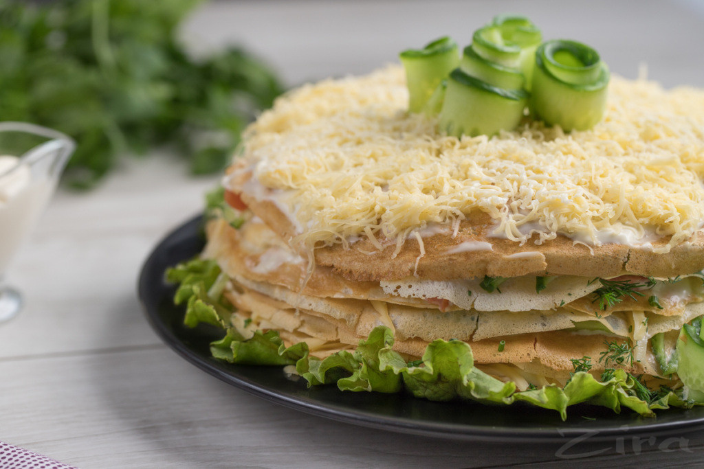 Eng oxirgi qavatini esa ta'bga qarab bezatamiz, bizlar pishloq sepib, bodring bo'lakchalari bilan bezatdik. Bu yog'i esa xohishingizga havola!