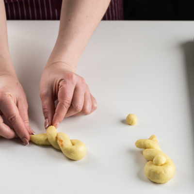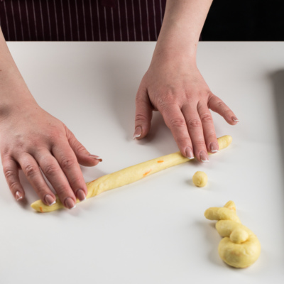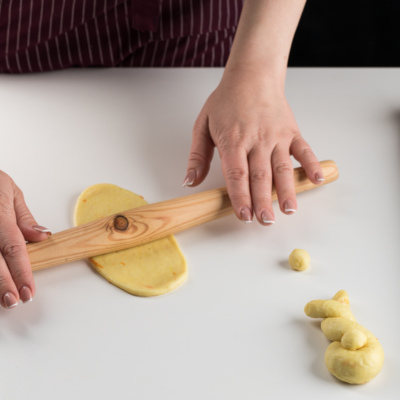 Xamir yumshoq va egiluvchan bo'lgunga qadar un solinadi.