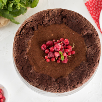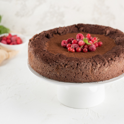 Pirog ustini kakao va rezavor mevalar bilan bezatib chiqamiz.