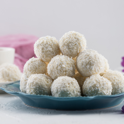 Orasiga bittadan bodom qo'yib, koptokchalar yasab olamiz. Kokos qirindisiga belab olsak bo'ldi, konfetlar ham tayyor!