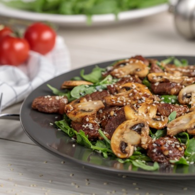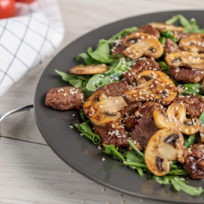 Bugun 3 xil masalliqlardan tayyorlaniladigan juda mazali salat tayyorlashni sizlarga tavsiya. Go’sht, qo’ziqorin va rukkoladan tayyorlaniladigan bu salat bemalol ovqatning o’rnini bosa oladi.