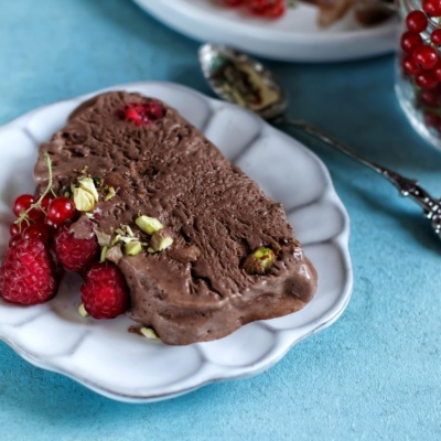 Malina va xandon pista qo’shib tayyorlaniladigan bu muzqaymoqni hajmi 22×11 sm li keks qolipiga tayyorlab olamiz. Ortib qolganlarini esa alohida konteynerlarga olamiz.