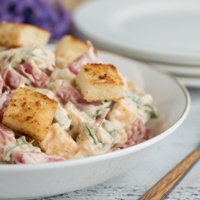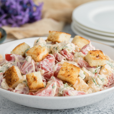 Dasturxonga tortishdan oldin quritilgan non bo'laklari va mayonez solib yaxshilab aralashtiring va ta'bga ko'ra tuz va murch seping.