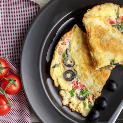 Quymoqning chetlari oqarib, o'rtasi xom qolganida, teng yarmiga barcha masalliqlarni solib chiqamiz – kolbasa, pomidor, zaytun mevasi, pishloq, ko'katlar va ustidan murch sepamiz.