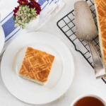 Tvorogli aralashmani xamir ustidan solib, ustini tekislaymiz. Ikkinchi xamirni esa ikkita pergament qog'oz o'rtasida yoyib olamiz. Pirog ustini yopib, chetki xamirlarni bir-biriga yopishtirib chiqamiz.