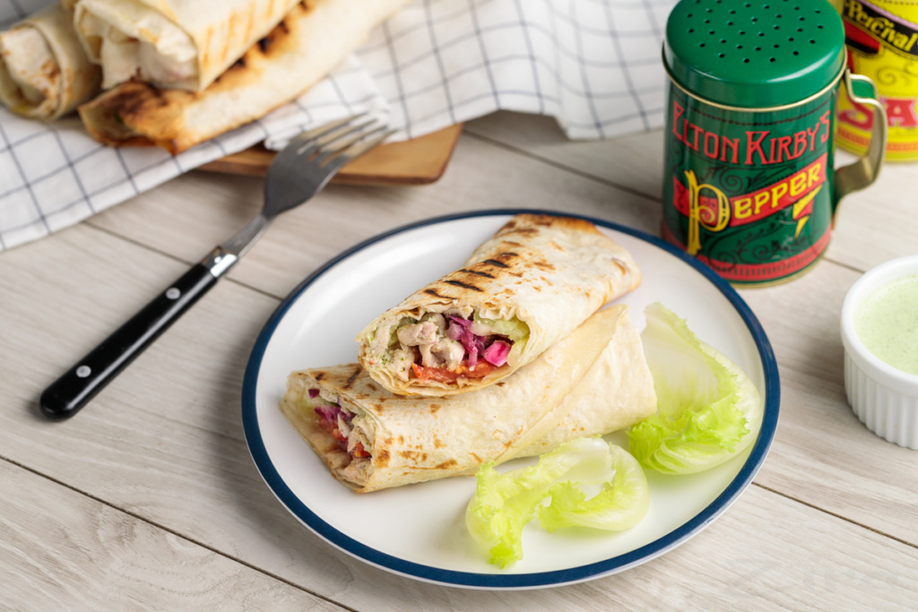 Lavashni o'rtasidan teng ikkiga bo'lamiz. Bir chetiga tovuq go'shti va sabzavotlar, marinadangan piyozni qo'yib, ustidan qaylani quyamiz.