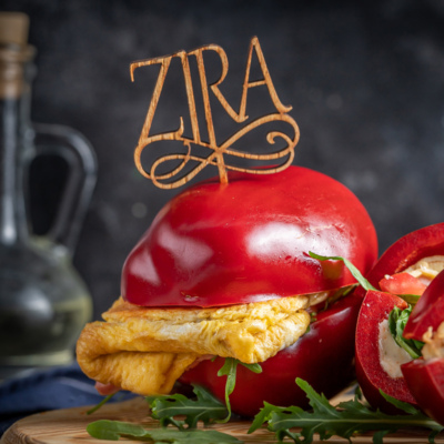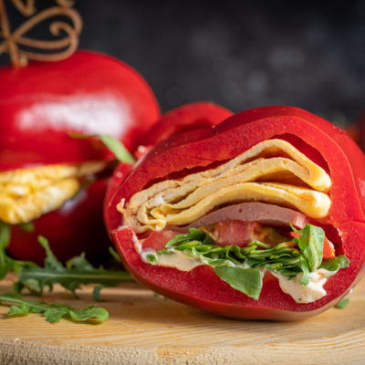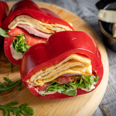 Bulg’or qalampirini ichiga yumshoq pishloq surtamiz. Ustiga rukkola, pomidor dumaloqchasi, vetchina, omletni terib, ustini bulg’orning ikkinchi bo’lagi bilan berkitamiz.