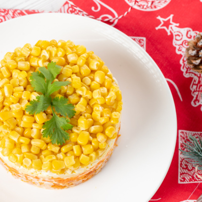 Oxirgi qatlam - konservalangan makkajo’xori. Ustini qoshiq bilan ezamiz, masalliqlar birlashib, to’kilib ketmasligi uchun.