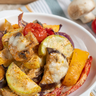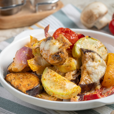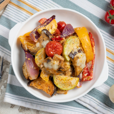 Motsarellani qirg’ichdan chiqarib, issiq sabzavotlar ustiga sepib, yana 5-10 daqiqaga pechga qo’yamiz.