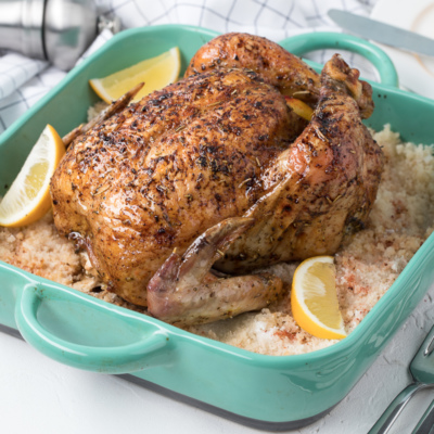 O'zingiz sevib iste'mol qiladigan ziravorlardan tovuq ichiga va ustiga sepib chiqasiz - bizlar bunda rozmarin, rayhon va oreganodan foydalandik.