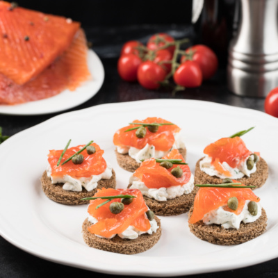Gulmohi balig'i va tvorogli baliqdan tayyorlangan mini-buterbrodlar