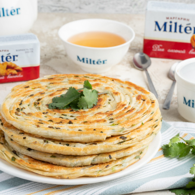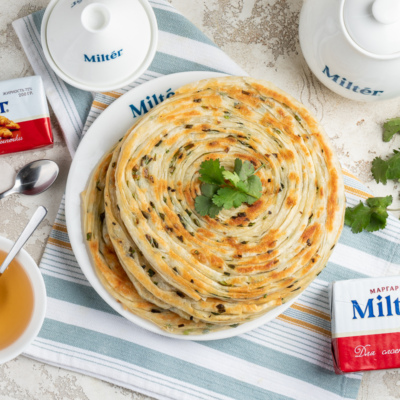 Xamir ustiga eritilgan margarin surtib, maydalangan ko’kpiyoz sepamiz va ustiga yana bir xamirni qo’yib xuddi shi harakatlarni qaytaramiz.