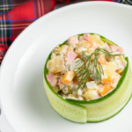 Tarelkaga oshpazlik qolipini qo’yib, chetiga doira shaklida bodringni joylashtiramiz.