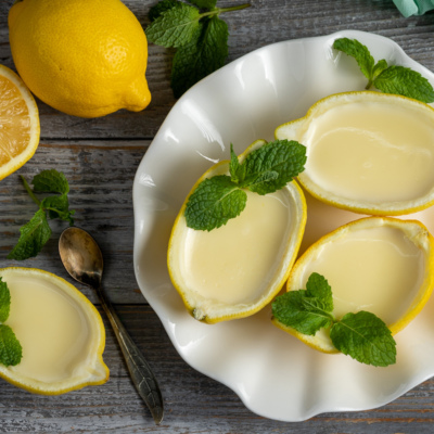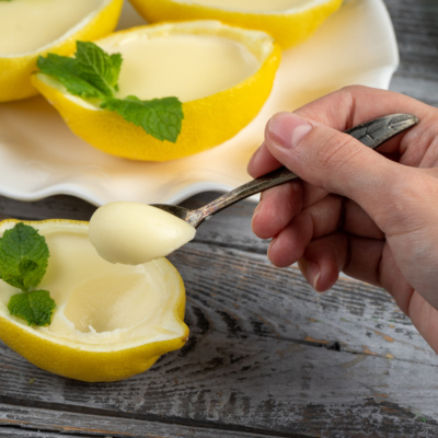Massani sitodan o’tkazib, limon po’stlog’i ichiga quyamiz va sovutgichga 1 soatga qo’yamiz.