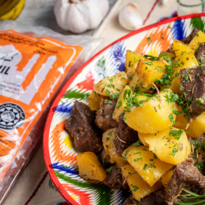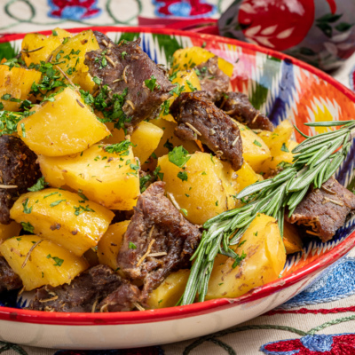 Kartoshka va xushbo’y ziravorlar bilan pechda pishirilgan mol go’shti – to’yimli va suvli taom bo’lib, uni ham har kungi tushlik uchun, ham bayramona dasturxon uchun tayyorlash mumkin.