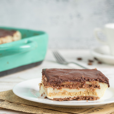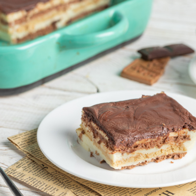 Qolipga pechenyelarni teramiz. Ustiga qalin qilib krem surtamiz. Krem tugaguncha pechenye va krem qatlamlarini solib chiqamiz. Oxirgi qavat krem bo’lishi kerak.