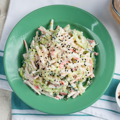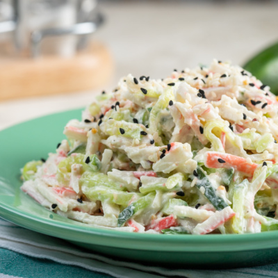 Atigi 2 ta masalliq va zapravkadan iborat oddiy, ammo mazali salat tayyorlash usulini sizga tavsiya qilamiz. Bodringning yaxna ta’mi  va biroz shirali qisqichbaqa ta’mi, hamda smetana va xantal asosidagi zapravka ajoyib uyg’unlik yaratadi.