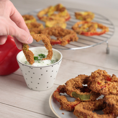 Har bir bulg'or qalampiri halqachasini avval unli aralashmada, so'ng tuxumda, keyin esa maydalangan suxarilara bulg'ab olamiz.