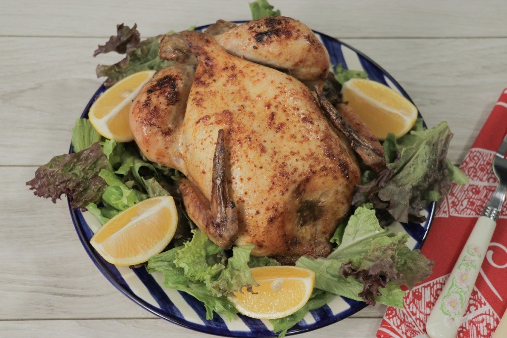 Tovuq yuvilib quritiladi va yuqoridagi ziravorlar ustki tomoniga ham ichki tomoniga ham sepiladi.