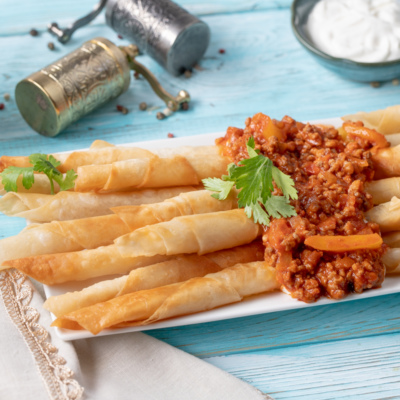 Dasturxonga tortish uchun likopchani o'rtasiga smetana, ustidan qiyma qo'yib, yonlariga naychalarni joylashtirib chiqamiz.