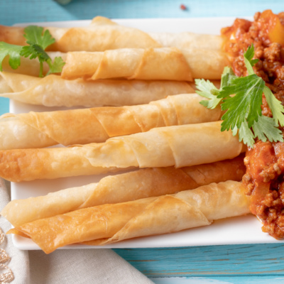 Boshqa tovaga 150 millilitr o'simlik yog'ini quyib, lavash xamiridan qilingan naychalarimizni ikki taraflama qovurib olamiz.