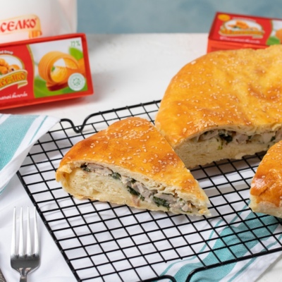 Birinchi rulet shaklidagi xamirni 2 mm qalinlikda yoyib, gaz pechi patnisiga joylashtiramiz. Ustidan tovuqli asosni qo'yib, ikkinchi ruletni ham yoyib, asos ustini yopamiz. Yonlarini yopib chiqamiz.