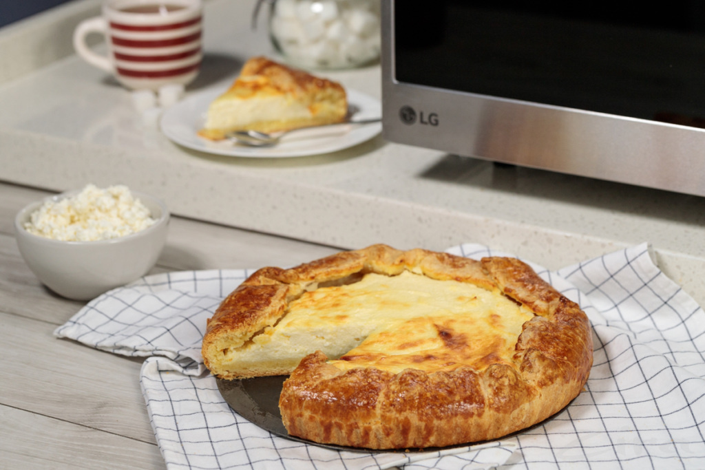 Xamirni olib, qolipdan sal kattaroq qilib yoyamiz. Qolipga joylashtirib, ichiga tvorogli aralashmani solamiz. Ortgan xamir chetlarini tepaga qilib buklaymiz. Chetki xamirlar ustiga tuxum sarig'idan surtamiz.