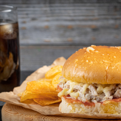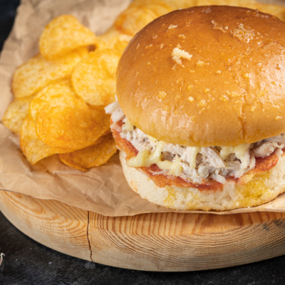 Ustiga qirg’ichdan chiqarilgan pishloq sepib, bulochkaning ikkinchi qismi bilan berkitamiz.