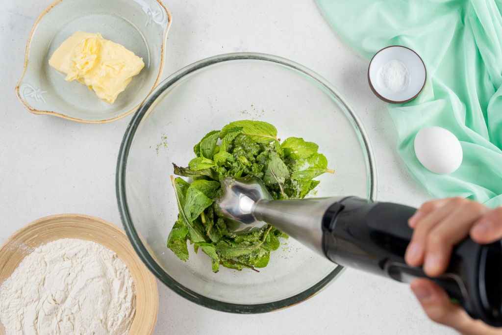 Alohida idishga yalpiz barglarini solib. shakar qo’shib aralashtiramiz. Shakar va yalpizni blender yordamida maydalaymiz.