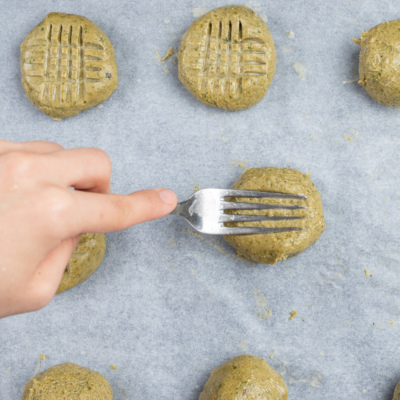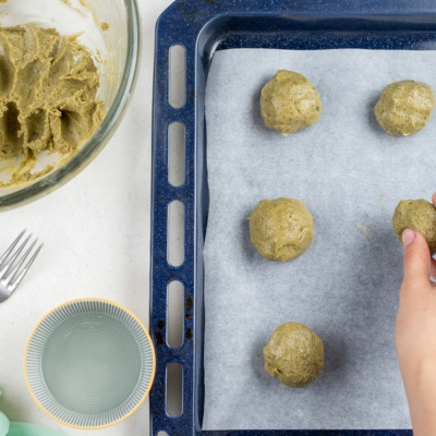 Xamir qo’lga yopishmasligi uchun, qo’llarni suvlang. Nam qo’llar yordamida kichkina bo’laklar olamiz, dumaloq holatga keltirib, pergament qog’ozi solingan patnisga, orasida masofa qoldirgan holda teramiz.